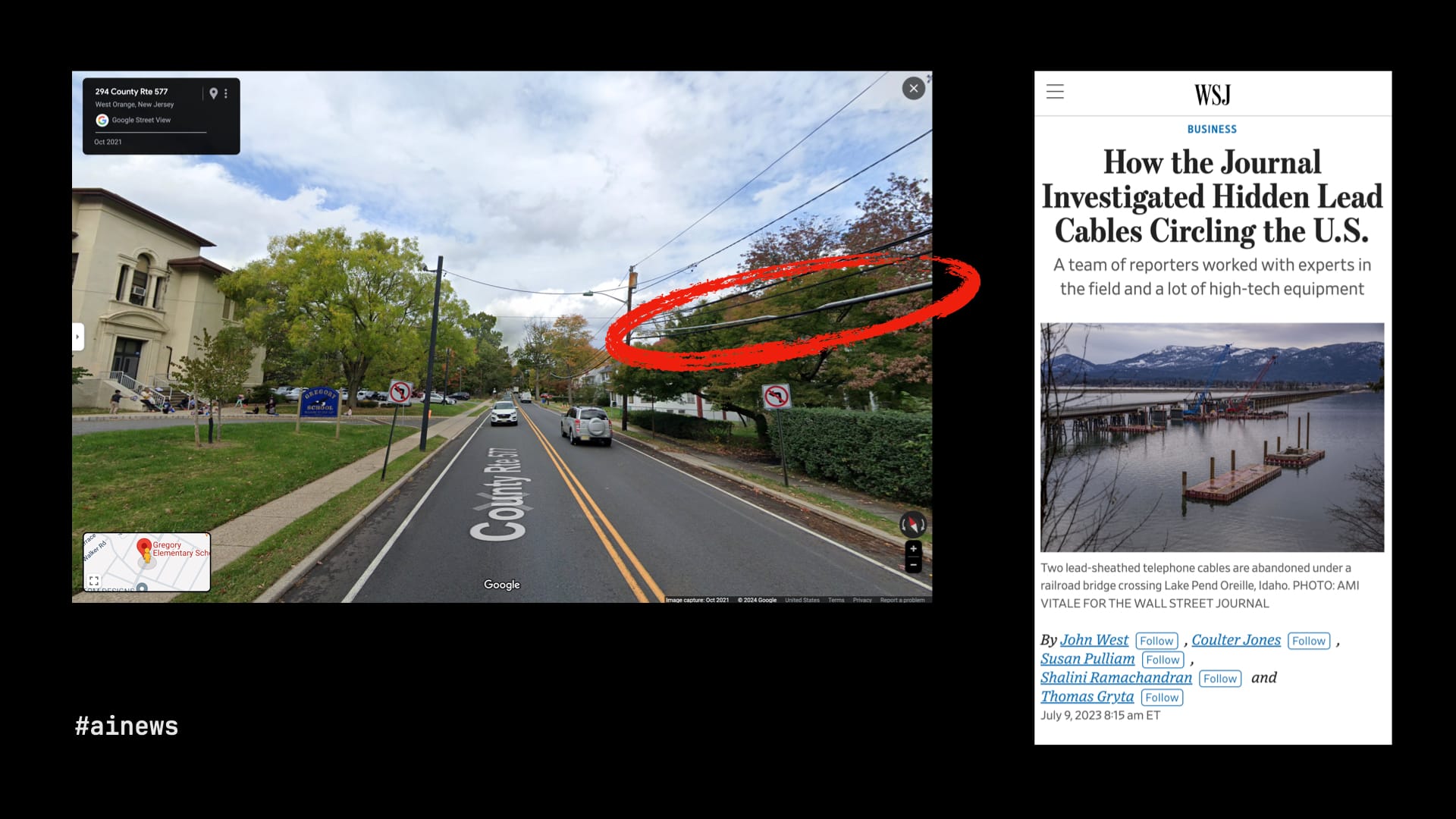 One aspect of the investigation, led by John Bebe-West, used Google StreetView images around schools in New Jersey. Now, to you and me, this just looks like an idyllic suburb on a partly cloudy day. But to a machine-learning model trained on what lead cabling looks like, it's a public health crisis. The Journal found loads of lead cabling in public areas around the country, and went to a lot of those places to do actual tests for lead exposure, which in many cases found extremely high levels.