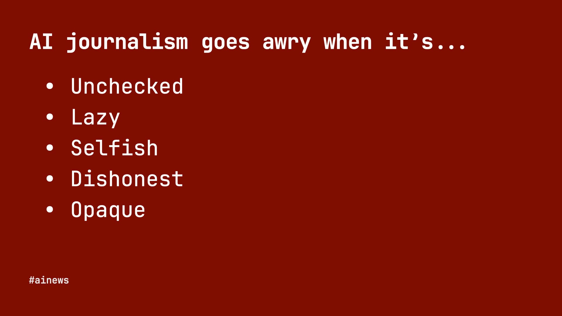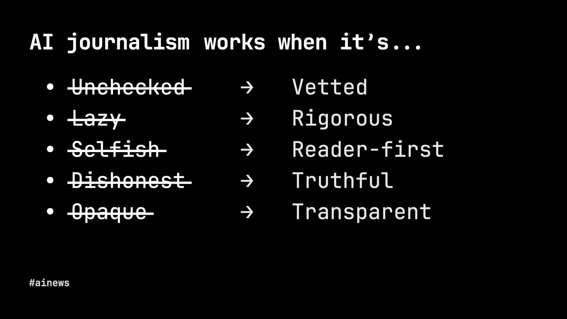 So how might we think about AI journalism that works? Well, it's got to be vetted, in a rigorous way. The idea should be motivated by what's best for readers. And, above all, the first principles of journalism must apply: truth and transparency.