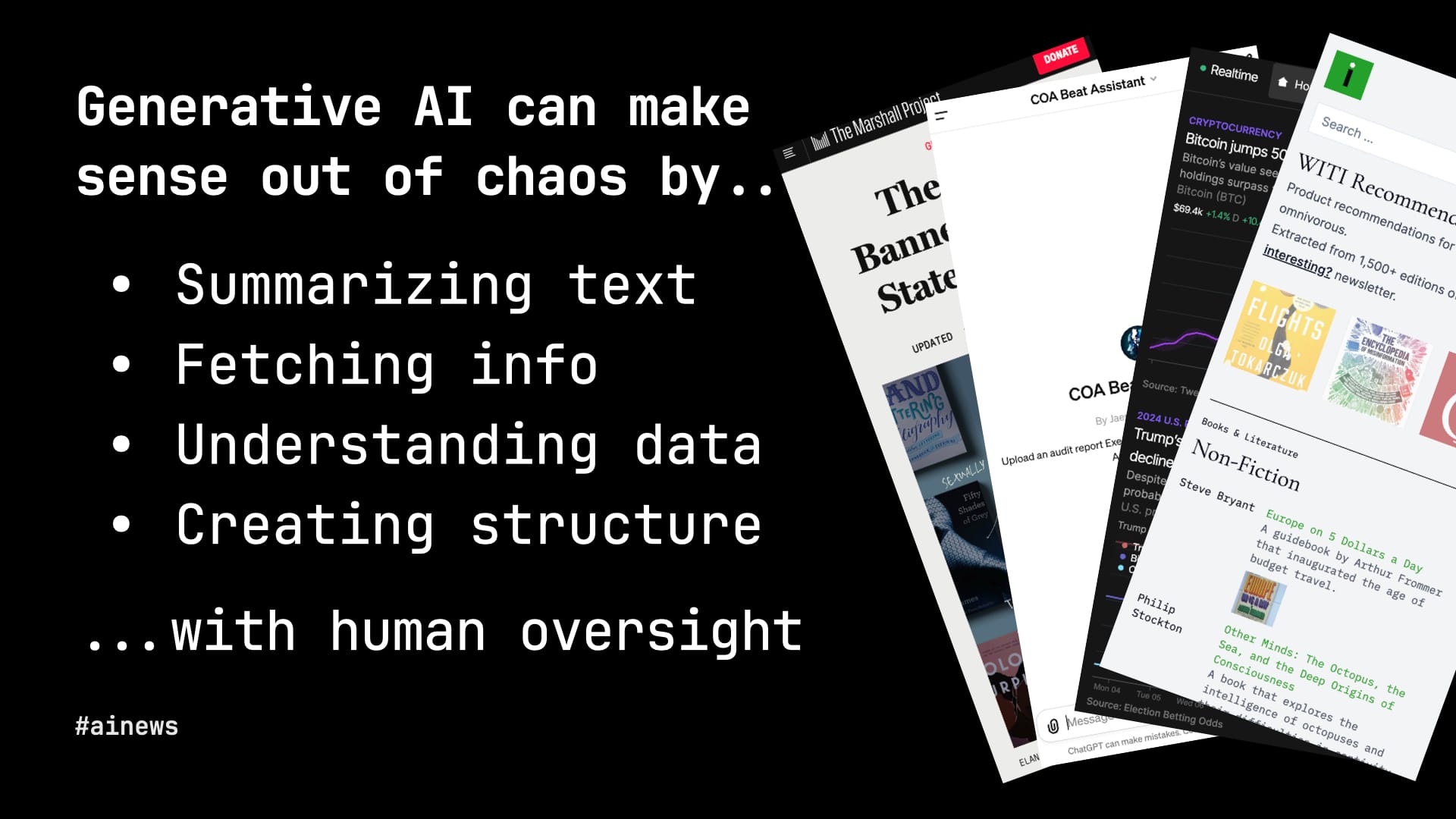 Of course, a lot of this has been possible for many years. But there are some equally inspiring uses of the hottest new machine-learning technology, LLMs, or generative AI. If traditional machine learning is good at finding patterns in a mess of data, you might say that generative AI's superpower is creating patterns. So let's look at a few examples of that in action for news.