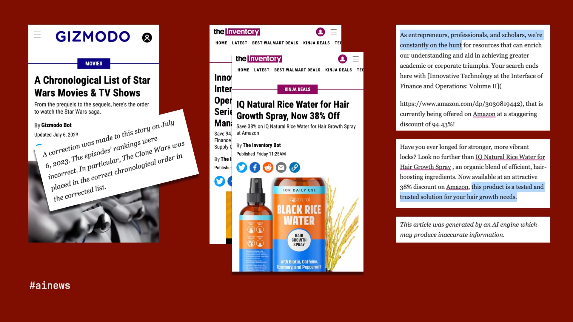 Chastened by that high-profile mistake, G/O largely backed away from its AI experiments, but to this day, it continues to publish a raft of bot-written articles on its product-recommendation site, The Inventory, hawking such deals as 94.43% off a supply-chain management textbook and great savings on snake oil for your hair. More galling is some of the copy on these articles, in which "The Inventory Bot" refers to itself as an entrepreneur and suggests the products are "tested and trusted." Only a brief line at the end of each article discloses—or, really, disclaims, "This article was generated by an AI engine, which may produce inaccurate information." It may, but it's all worth it for that rice-water affiliate revenue.
