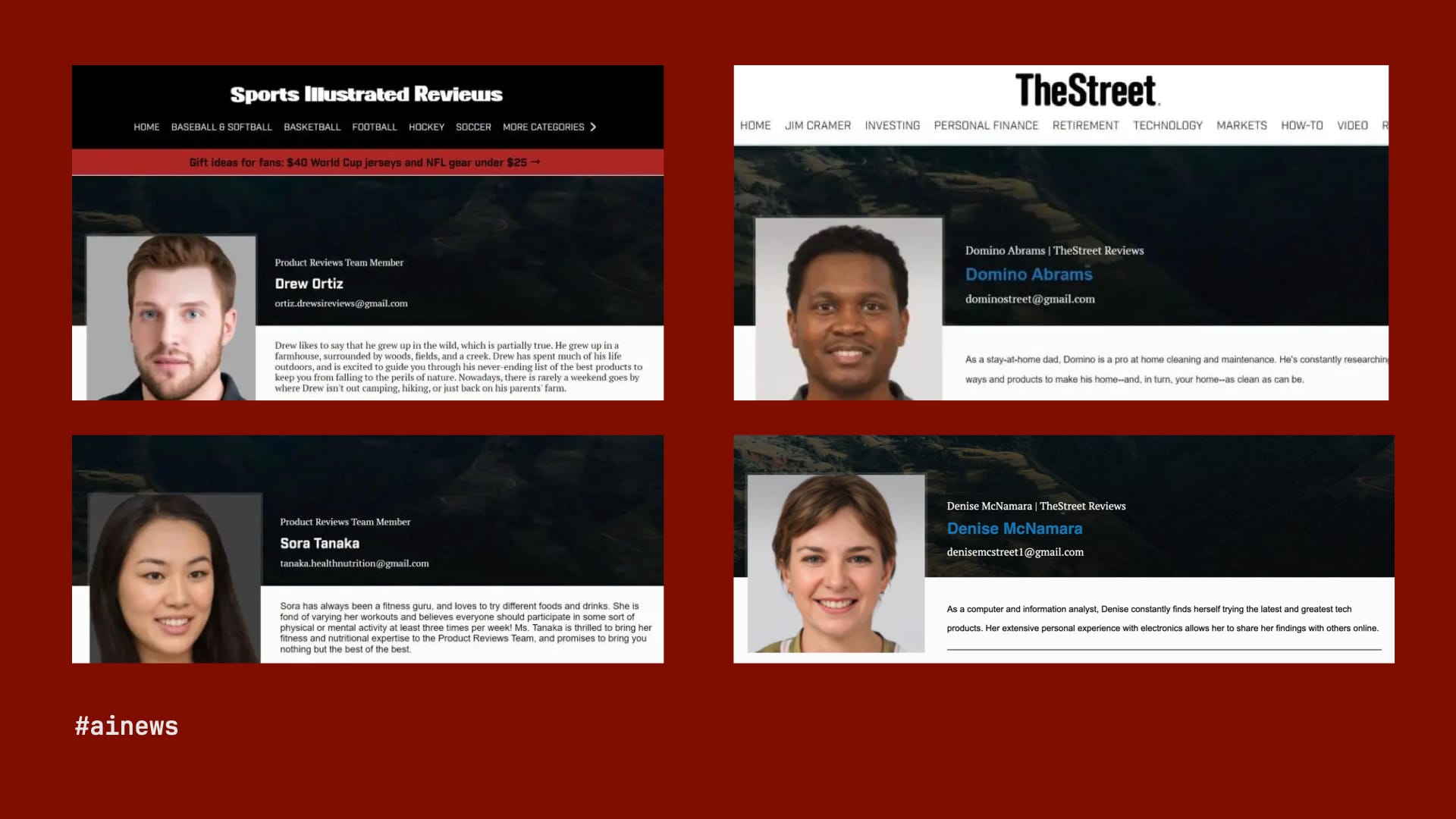 You get the idea. Arena Group, which licensed Sports Illustrated and owns The Street, was recently caught doing something similar with its AI-written reviews. The added spin here was that Drew, Sora, Domino, and Denise do not exist. Their photos were taken from a stock-imagery site. A lie on top of a lie on top of a lie.