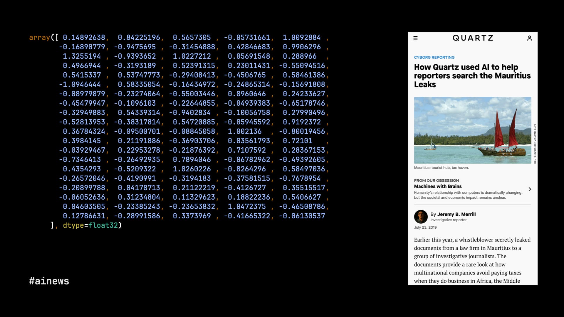 - Quartz: "How Quartz used AI to help reporters search the Mauritius Leaks," by Jeremy B. Merrill