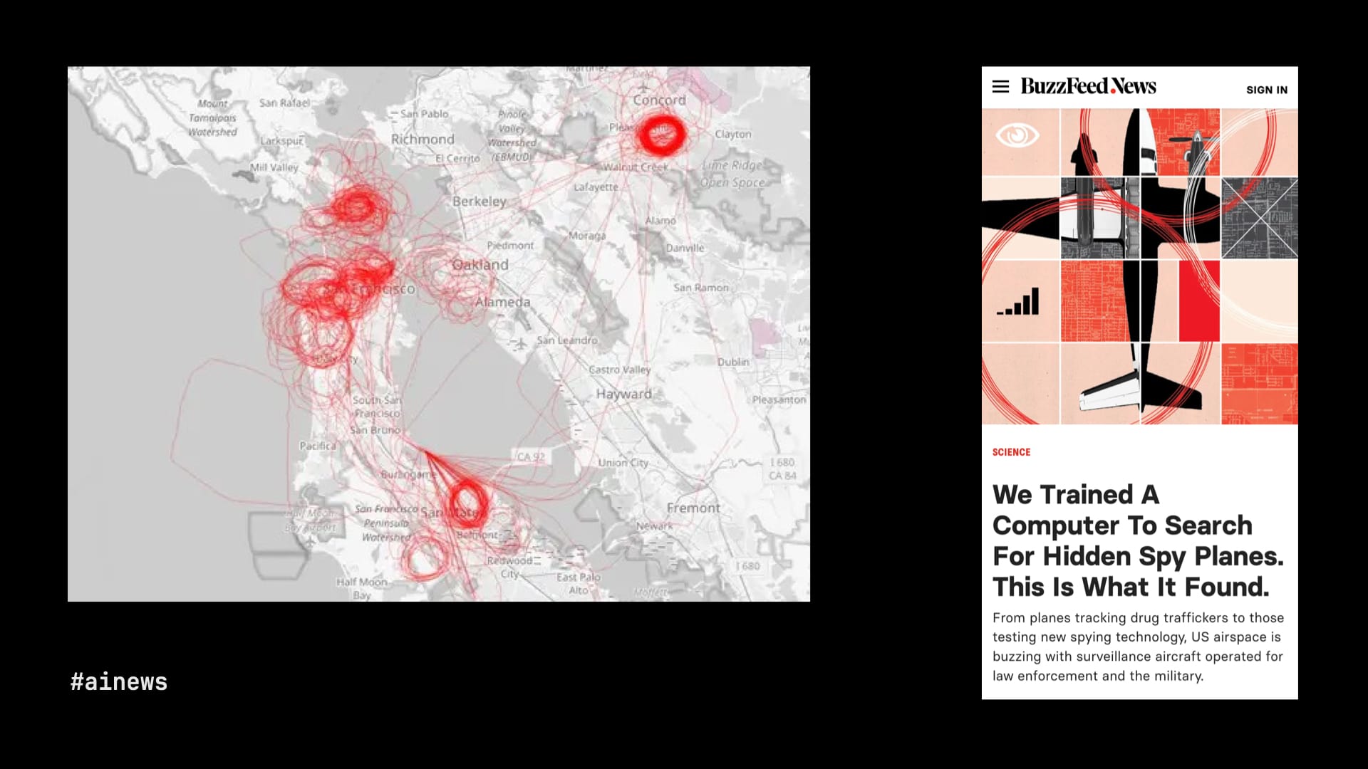 - BuzzFeed News: "We Trained A Computer To Search For Hidden Spy Planes. This Is What It Found," by Peter Aldhous