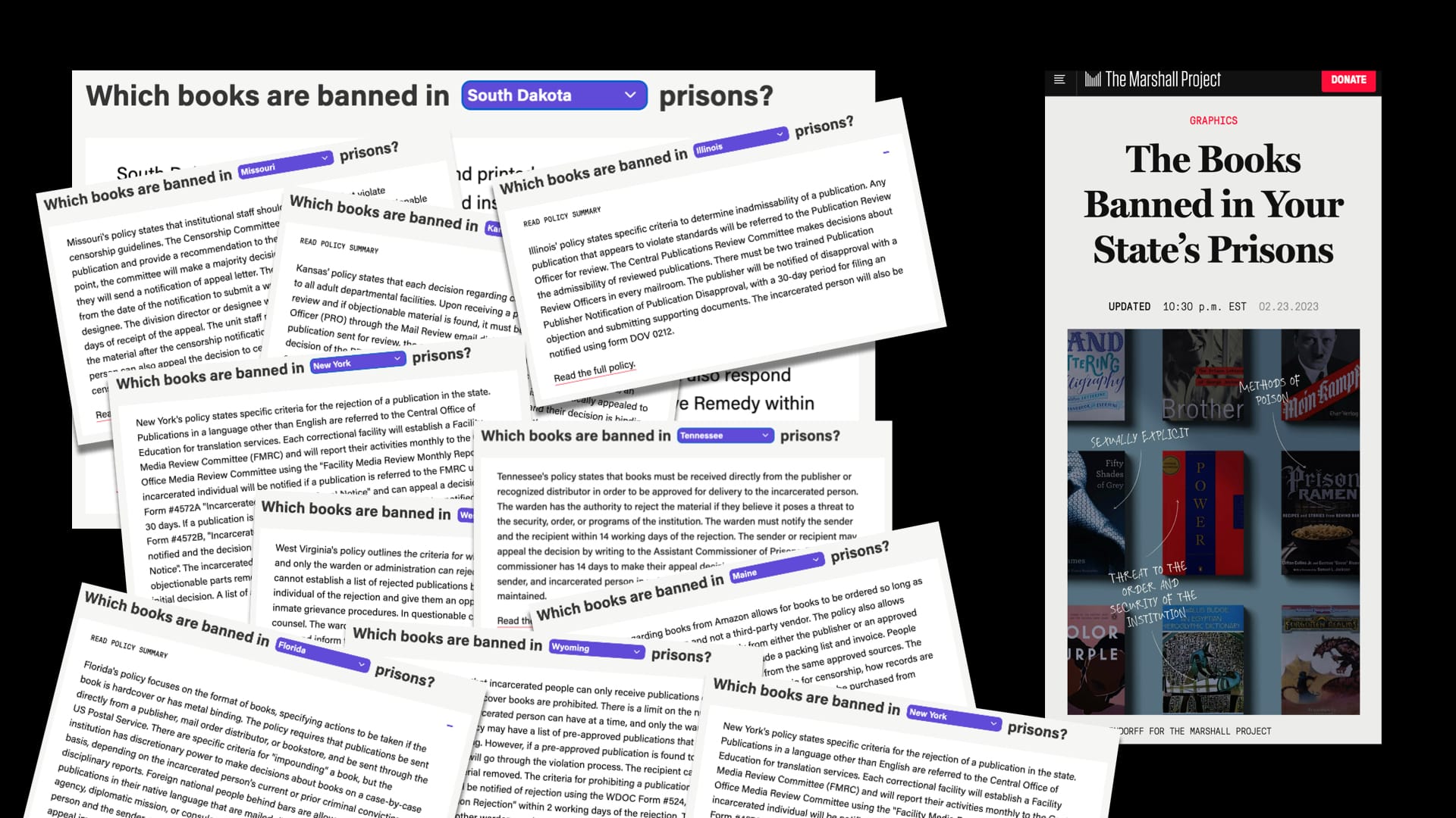 - The Marshall Project: "The Books Banned in Your State's Prisons," by Keri Blakinger, Ryan Murphy, Elan Kiderman Ullendorff, and Andrew Rodriguez Calderón