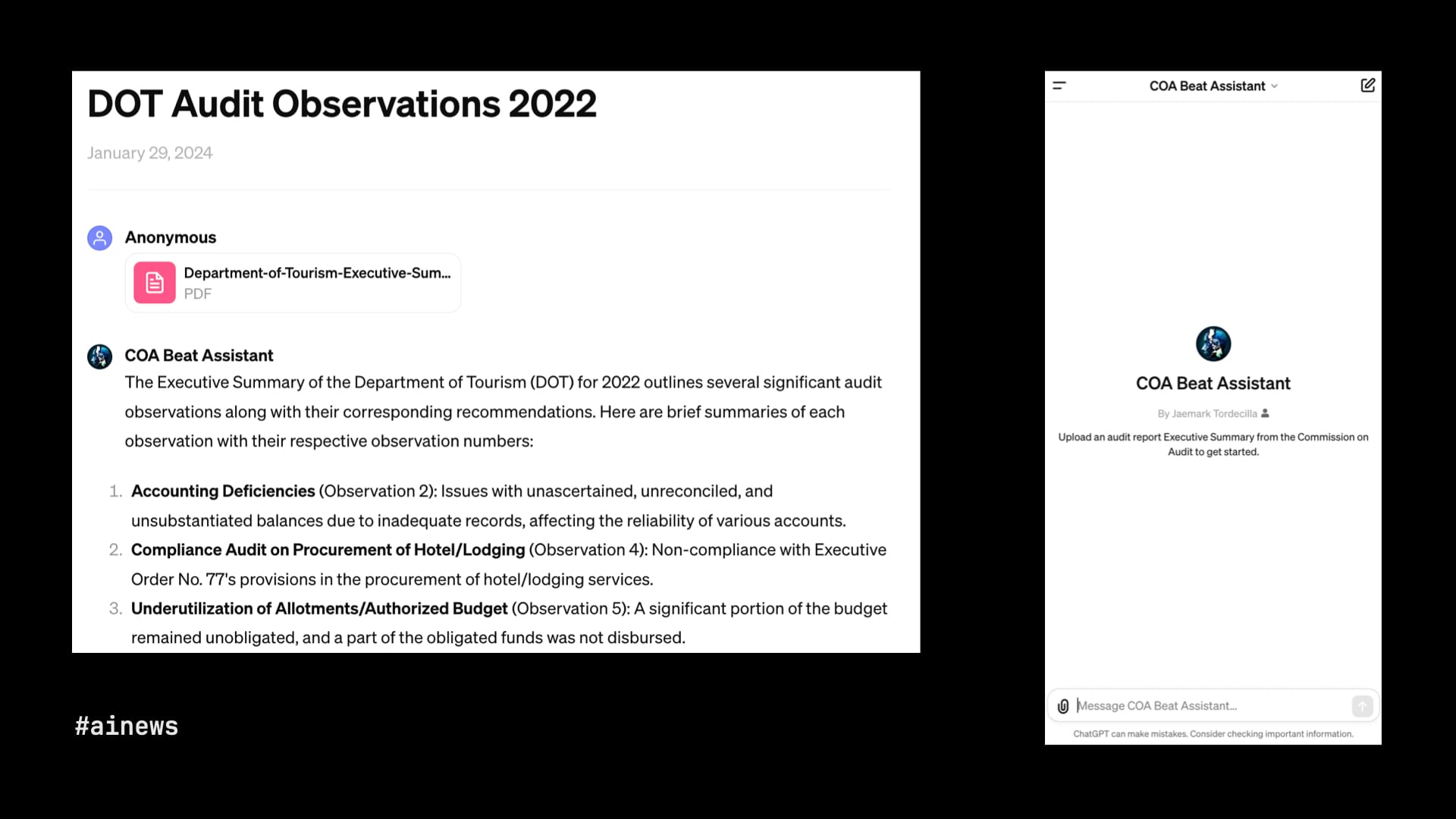 Jaemark Tordecilla, a Filipino journalist who's currently a fellow at the Nieman Foundation, found similar success decoding bureaucratic documents with an LLM. He built a custom GPT trained to summarize audit reports of government agencies in the Philippines. These reports often turn up evidence of corruption, but they are very long and hard to read. Now, several Filipino journalists are making use of Jaemark's tool to identify graft and find promising new lines of reporting.