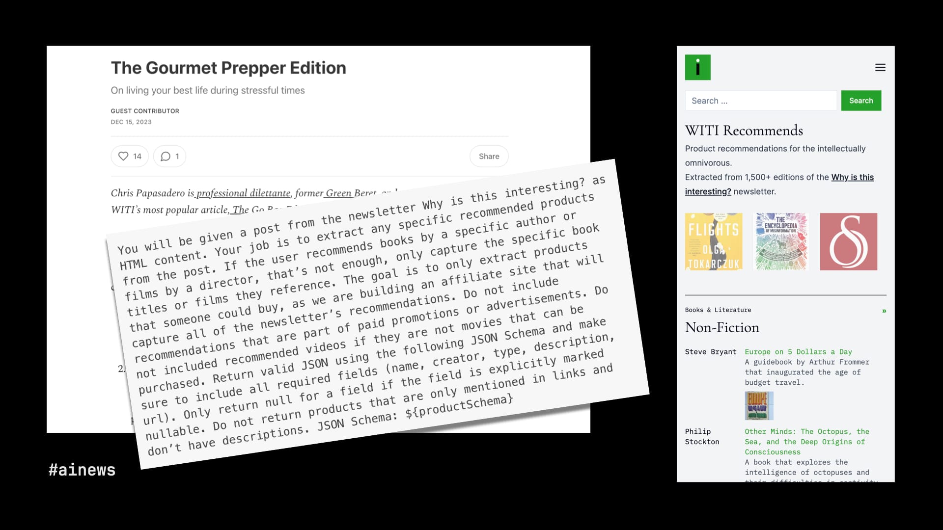 The problem, of course, was that the "recommendations" were buried in unstructured prose. Sometimes writers linked to products they hated or to things that aren't for sale. How could Noah create a database of just the recommendations of just the products for sale across 1,500 editions of the newsletter? The answer was a carefully tailored prompt for GPT-4, which was able to extract and classify the product recommendations in a display-ready format.