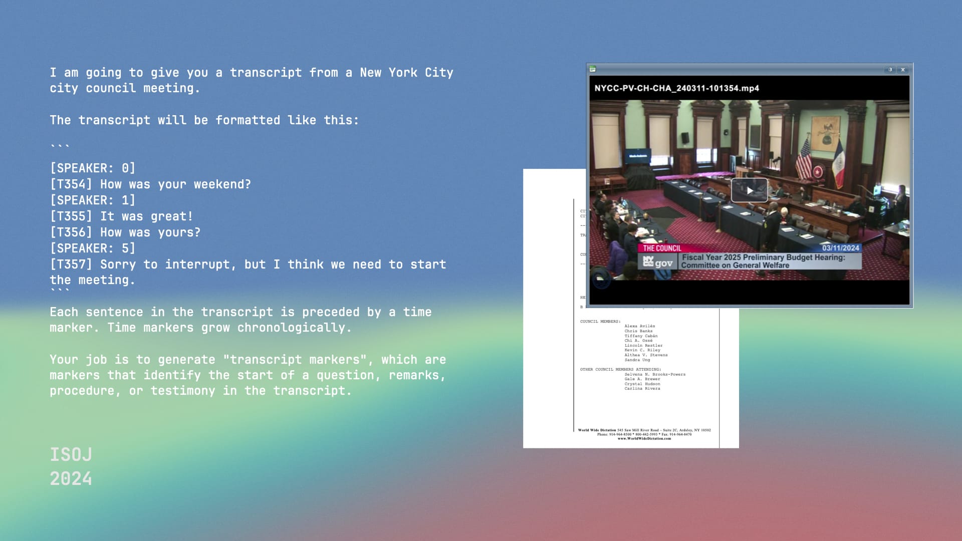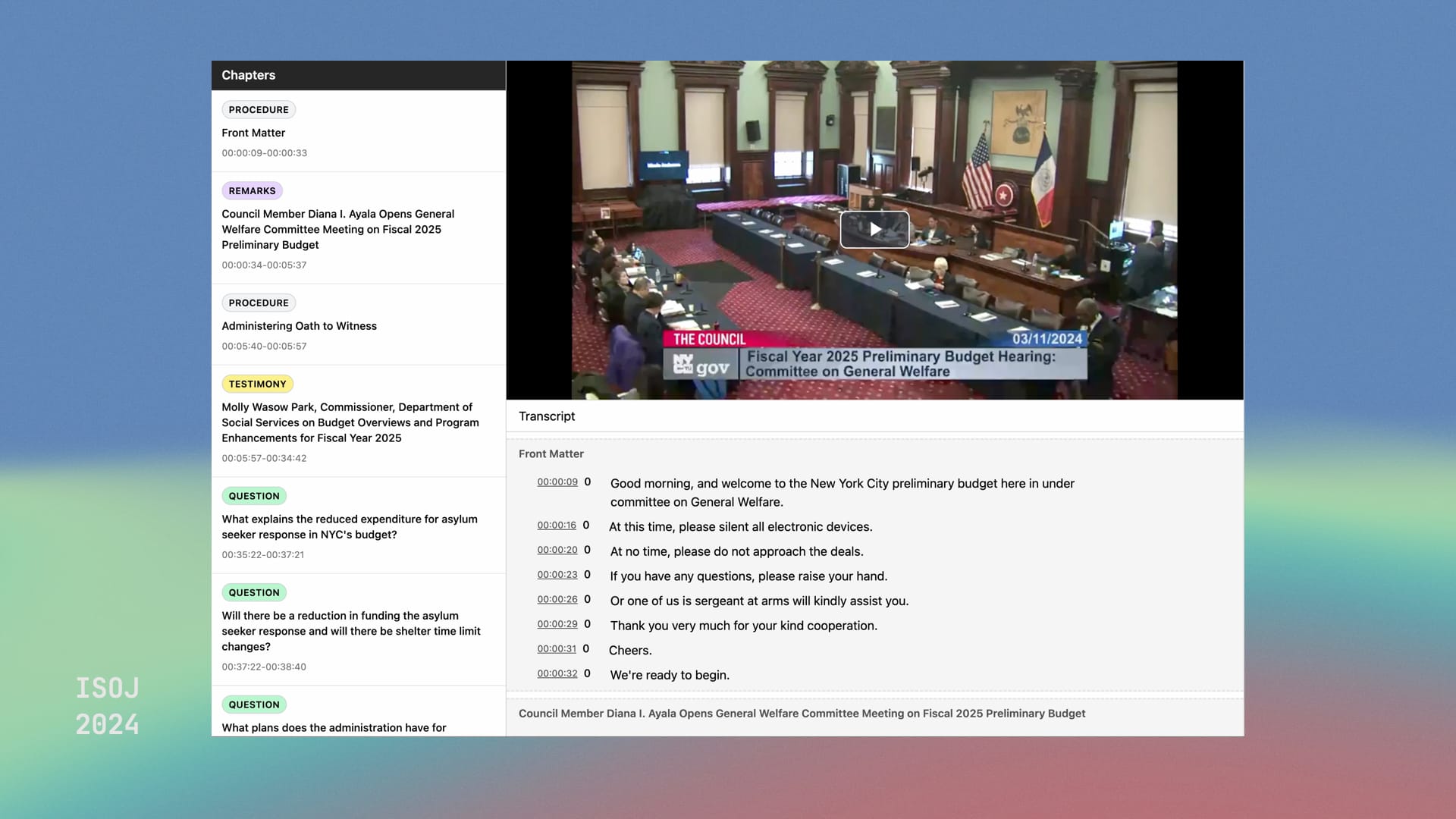 The city council does publish transcripts and video recordings of its meetings, if you can find them. Oberoi wrote detailed prompts for GPT-4 to break up the transcript into timestamped question-and-answer pairs he called chapters, give each chapter a helpful title, and summarize the salient points of the discussion.