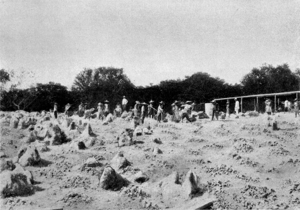 A worked-out phosphate field is a dismal, ghastly tract of land, with its thousands of upstanding white coral pinnacles from ten to thirty feet high, its cavernous depths littered with broken coral, abandoned tram tracks, discarded phosphate baskets, and rusted American kerosene tins.